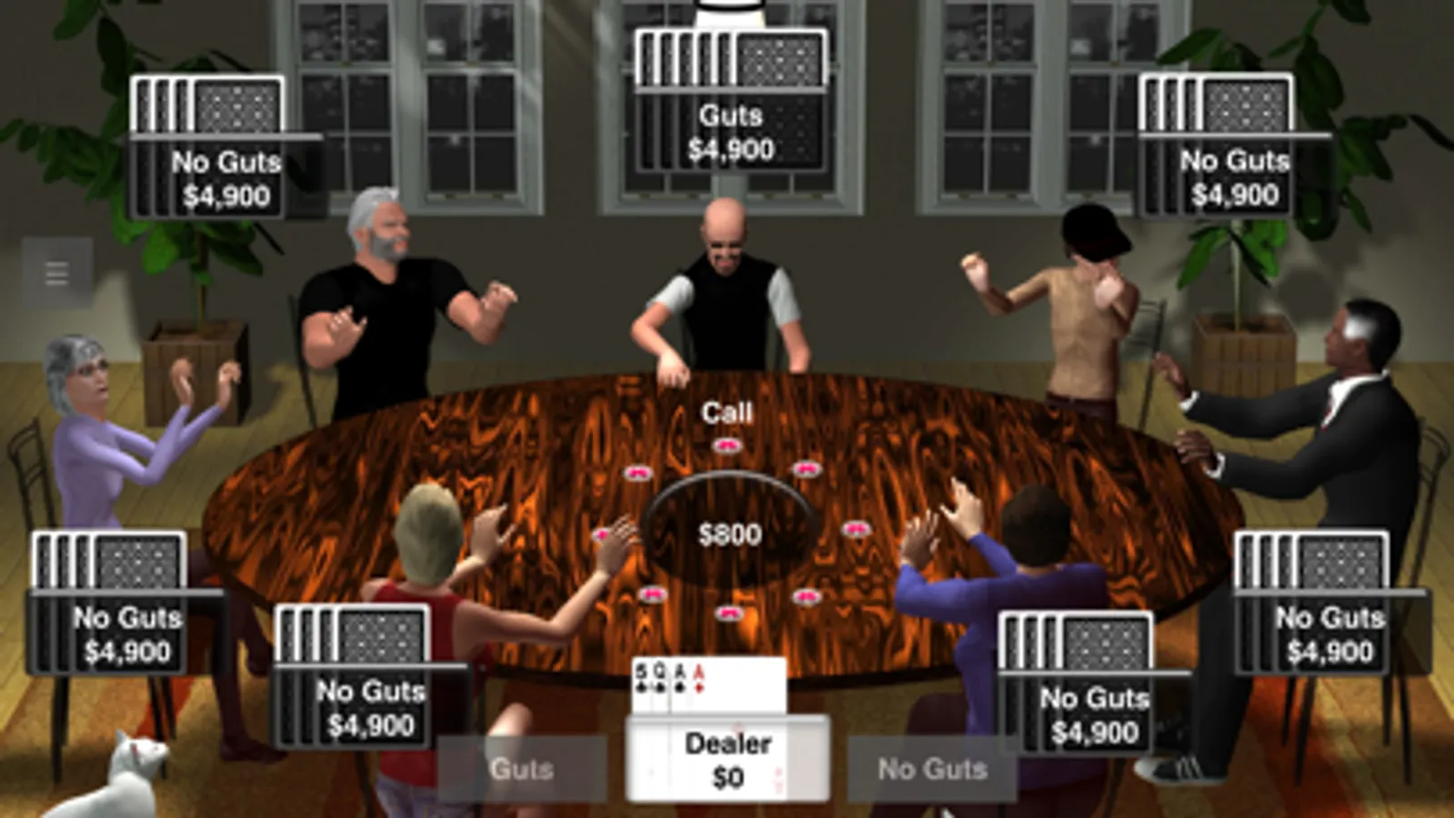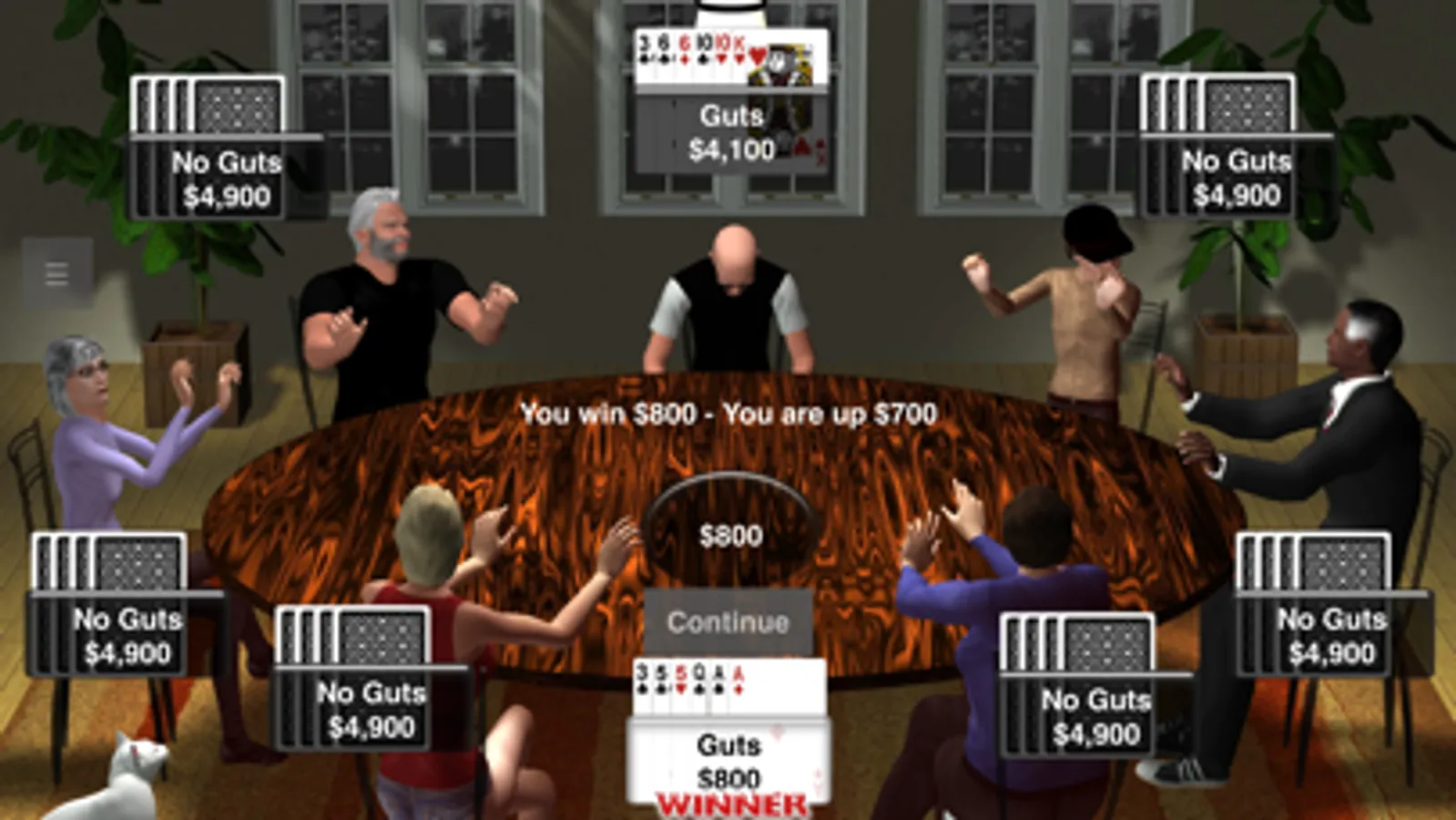 Guts Poker is a fast paced poker game where each player is dealt four cards and then must declare either in (has guts) or out (no guts). Two more cards are dealt, after which the winner with the best five card hand takes the pot. Losing players that called guts must then match the winning pot, which grows quickly.