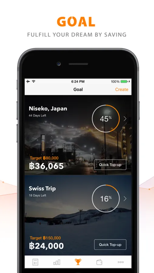 Create Goal and top-up money to your goal every day, week or month to make your dream come true.