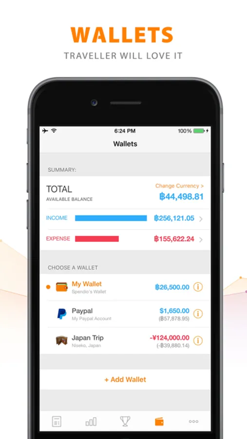 Create Wallet to separate your transactions. For example, when you travel aboard, you can create wallet named "Travel Aboard". Income or expense that add to this wallet won't interfere other wallets.