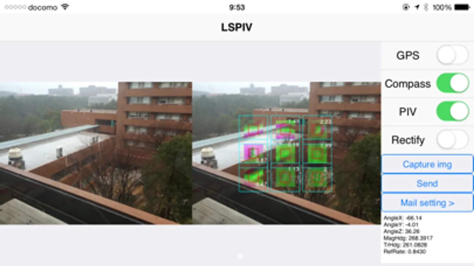 LSPIV (large-scale particle image velocimetry) is an image-based method for measuring velocity distribution on the water surface. Applications of LSPIV have been increasing for both field and laboratory experiments as unique and powerful tools for non-intrusive velocimetry using conventional imaging devices and specialized image processing software. This app utilizes a smartphone to implement LSPIV. By innovatively combining the sensors embedded in smartphones, the images captured with them can be intrinsically and instantly ortho-rectified without making recourse to GCPs.