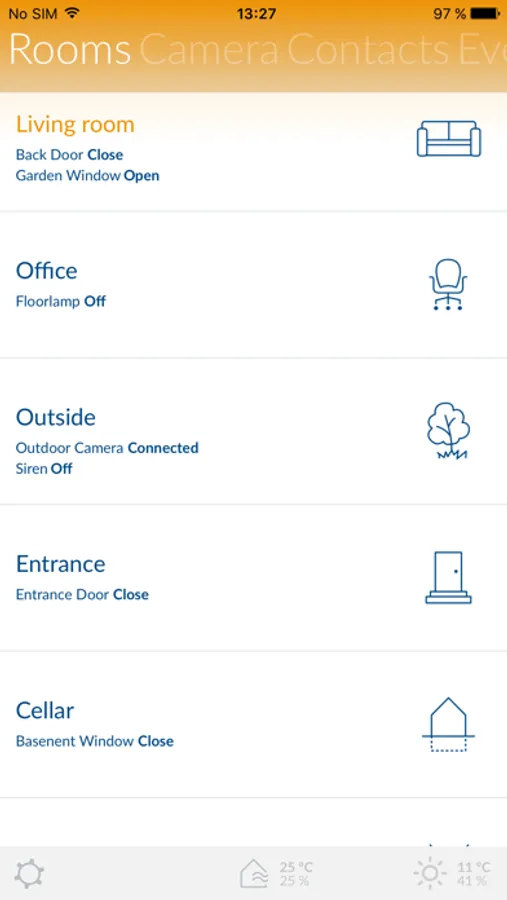 In the control menu up to 9 individual groups can be created. These enable the operation of all used actors, e.g. wireless power sockets, with one click. Furthermore, it can be defined, which sensors trigger an alarm when activated and which actors should react. The setup of a partial activation is also possible.