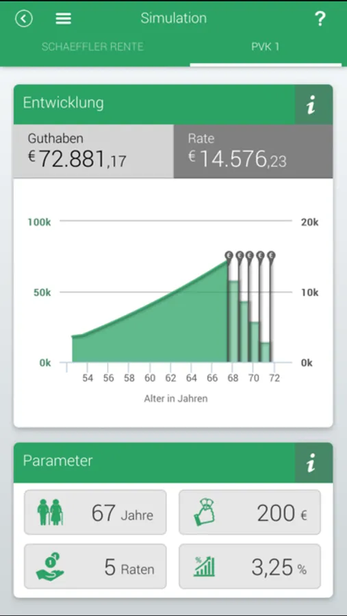 Behalten Sie Ihre Vorsorge und deren Entwicklung im Auge. Simulieren Sie Ihr Einkommen im Rentenalter und rufen Sie aktuelle Kontenauszüge ab: Die Schaeffler Zukunftsvorsorge-App ermöglicht Ihnen den einfachen Überblick über Ihre Schaeffler Altersvorsorgemodelle, mobil und rund um die Uhr.