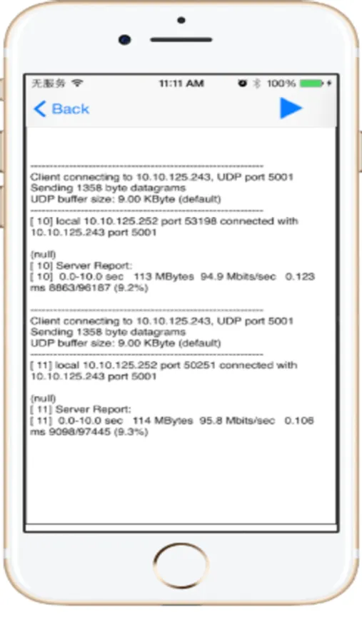 Accuracy is the key in terms of wireless throughput test, this perfessional tool reaches the most accurate IOS iPerf throughput test result compared with others, it achieved 115Mbits/sec download speed and 95.8Mbits/sec upload speed on iPhone5 with a Wi-Fi(WLAN) Access Point equipped 3x3 Antenna(802.11AN).