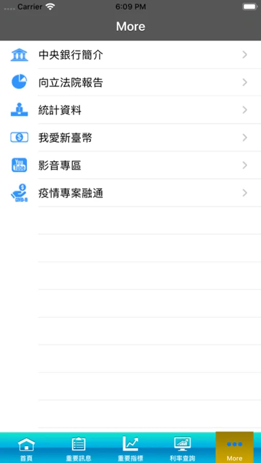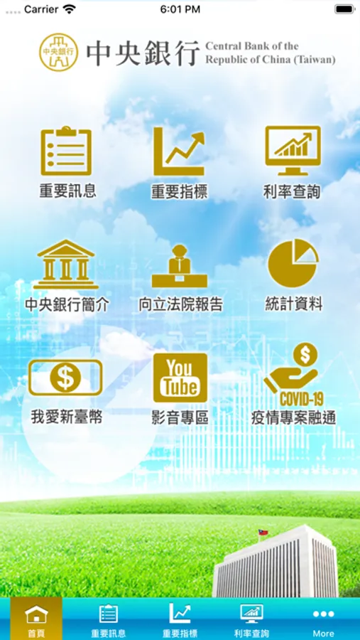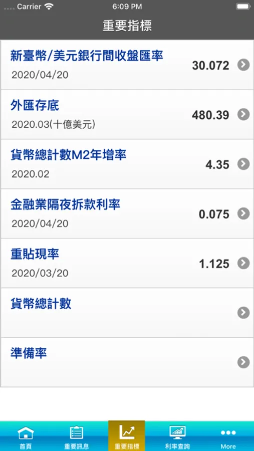 『重要指標』:提供重貼現率、金融業隔夜拆款利率、準備率、貨幣總計數、外匯存底、新台幣/美元銀行間收盤匯率等即時資訊查詢。