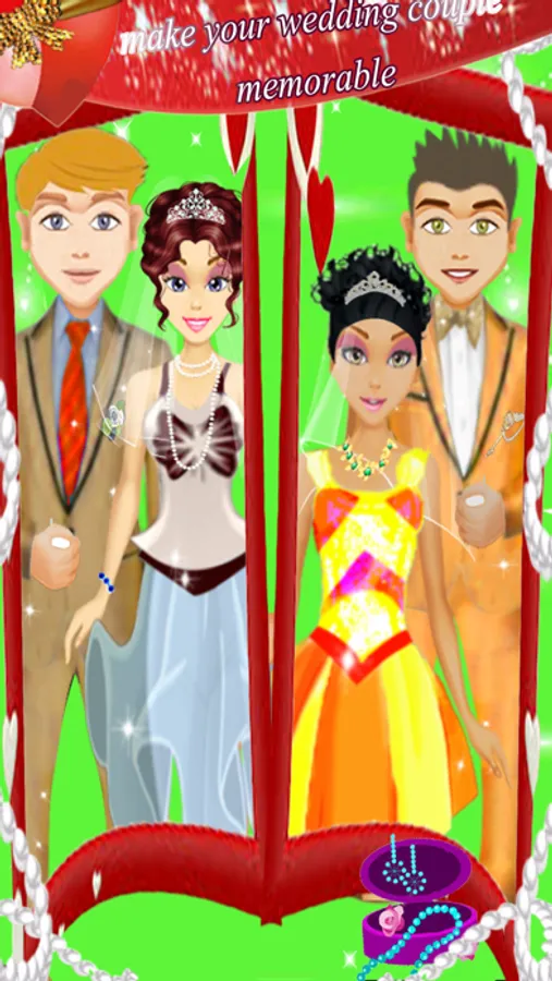 Prince(jack,Charles) and princess(sally,emma) are going to marriage. And they need your help to select their wedding dresses to dressup on their marriage ceremony. They want to wear latest fashion style clothes with royal and fairy touch. You have a penalty of new dresses in the wedding salon. You need to pick the right combination to dress them.