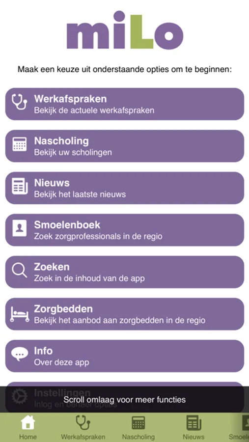 De miLo-app bevat een smoelenboek (wie is wie) met daarin de contactgegevens van de huisartsen, medisch specialisten, apothekers en specialisten ouderengeneeskunde in de regio Midden-Limburg-oost. Tevens zijn alle werkafspraken (Regionale Transmurale Afspraken) van in de app te vinden, welke zijn opgesteld door huisartsen en medisch specialisten tezamen. Er kunnen werkafspraken gezocht worden op categorie, op alfabet, en door middel van een algemene zoekfunctie.