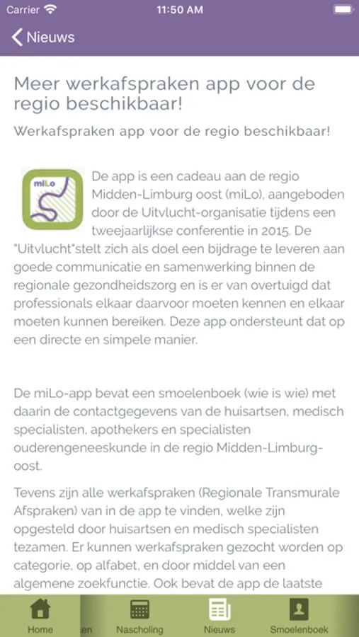 Deze app is een cadeau aan de regio Midden-Limburg oost (miLo), aangeboden door de Uitvlucht-organisatie tijdens een tweejaarlijkse conferentie in 2015. De "Uitvlucht"stelt zich als doel een bijdrage te leveren aan goede communicatie en samenwerking binnen de regionale gezondheidszorg en is er van overtuigd dat professionals elkaar daarvoor moeten kennen en elkaar moeten kunnen bereiken. Deze app ondersteunt dat op een directe en simpele manier.