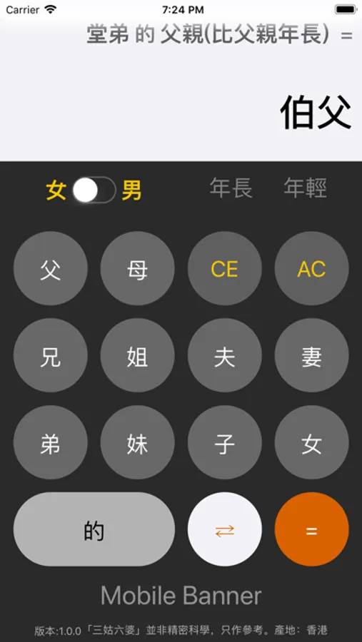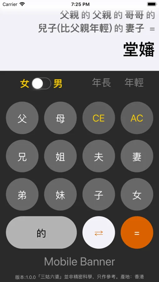 以計算機的操作方式輸入親戚關係,讓您快速查詢親戚的稱謂。