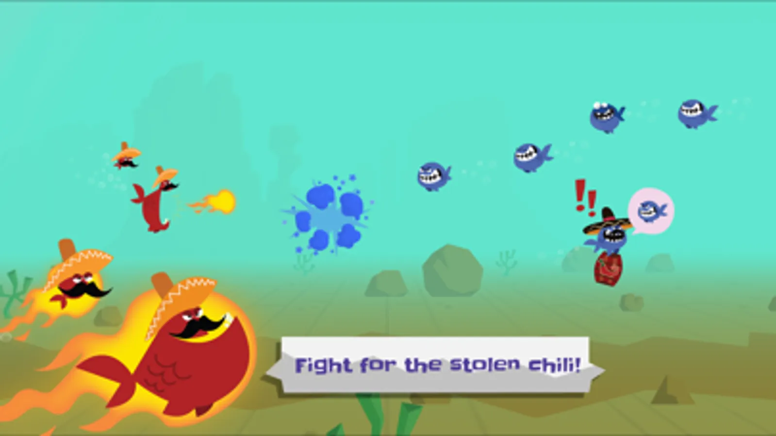 Travel alongside El Gordo and Pequenito on a journey to retrieve all the chili sauce stolen from their village. Touch the screen to make El Gordo swim up and release to let him swim down. Hit the fire button to launch a fireball and shoot your enemies to oblivion!
