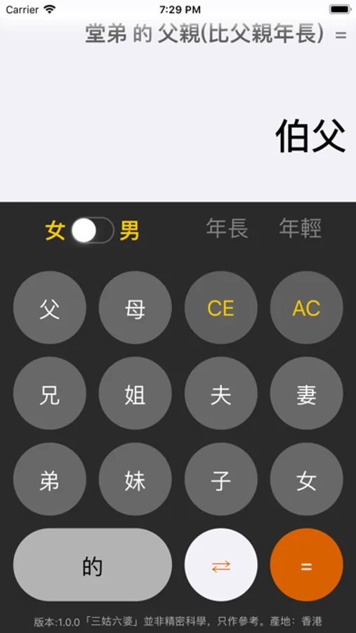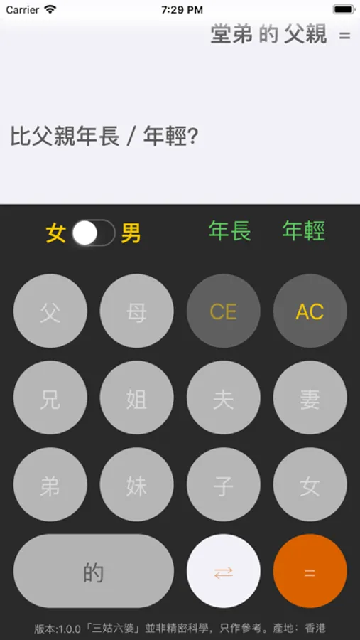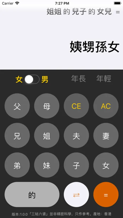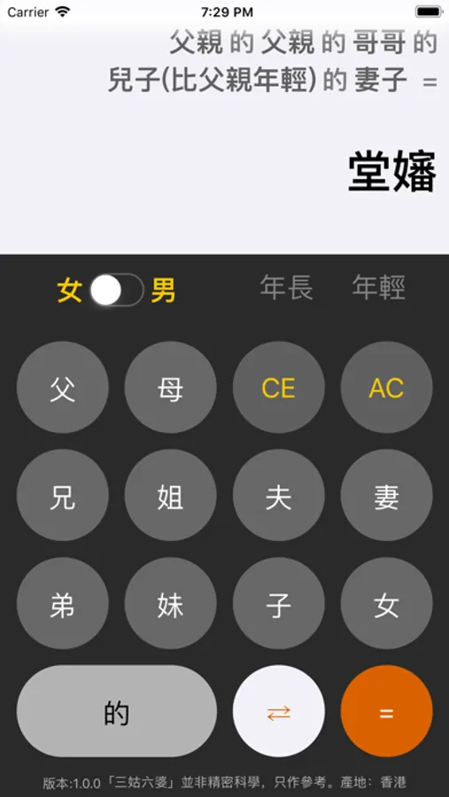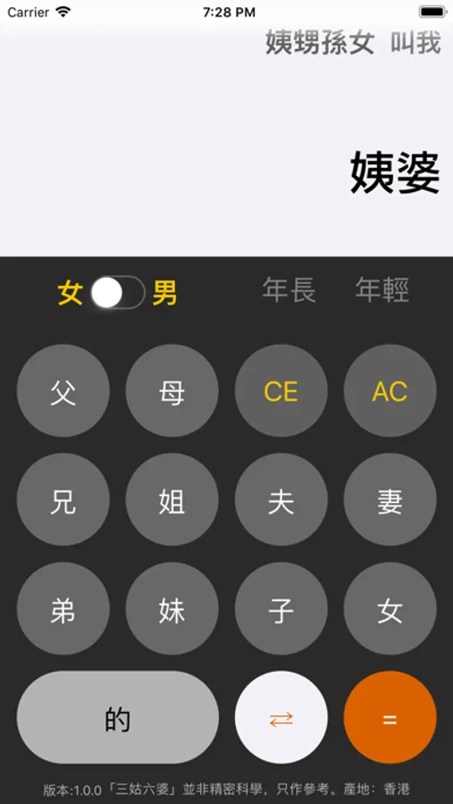 以計算機的操作方式輸入親戚關係,讓您快速查詢親戚的稱謂。