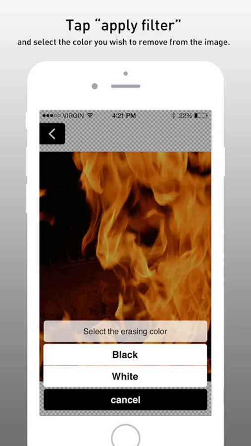 Tap “apply filter" and select the color you wish to remove from the image. (You can choose between white or black.)