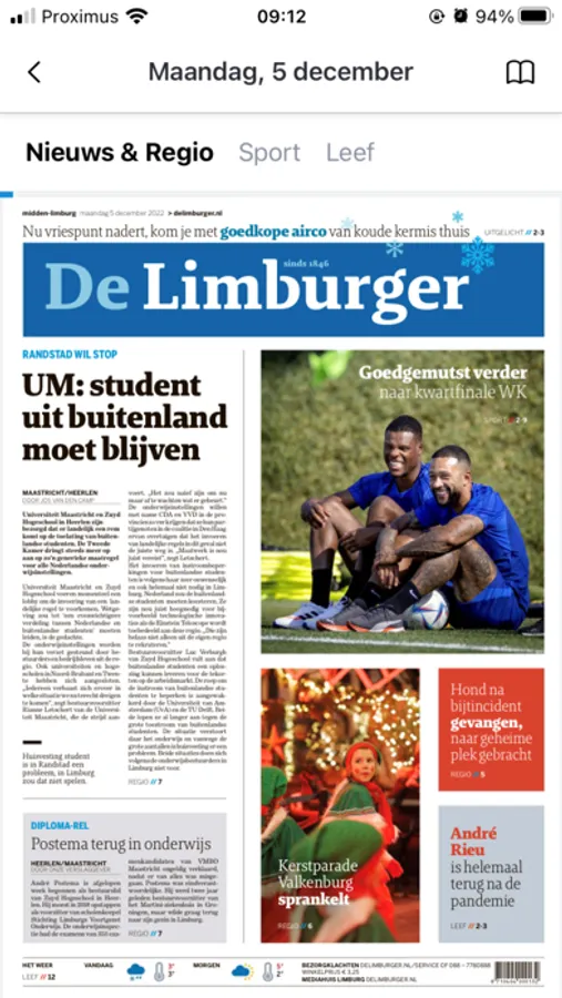 De Limburger Krant kun je gratis en onbeperkt gebruiken als je een Digitaal Extra, Zaterdag Extra of Compleet abonnement op De Limburger hebt. Heb je vragen over hoe je digitaal kunt lezen of ervaar je problemen? Neem dan contact op met onze Klantenservice via www.delimburger.nl/service. Telefoon 088 - 77 80 888.