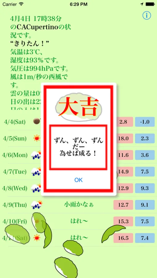 ・ずん子をスワイプすると飛び散るずんだ餅が「おみくじ」を引きます。運試し〜。