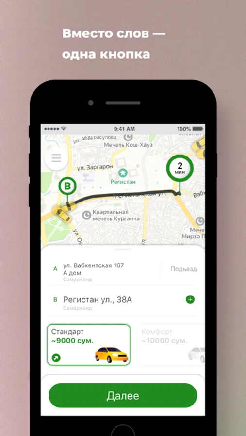 Откройте приложение, укажите адрес и закажите такси, нажав на одну кнопку.