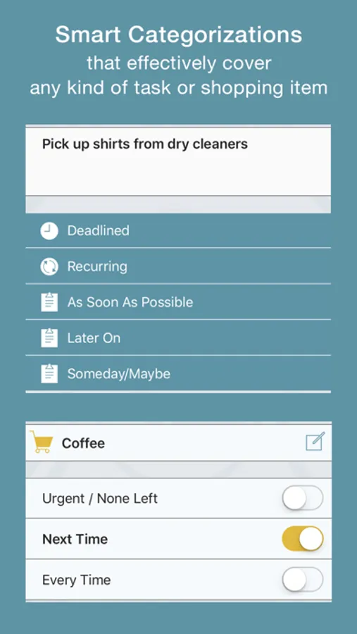 Create and manage your things to do in a flash. Taskuoise is the most practical personal to-do manager you can find. Its intelligently simple design enables you to define any kind of to-dos, shopping items or reminders with fewest possible actions and with all-intuitive gestures. Taskuoise’s efficient simplicity will keep you ahead of things to do.