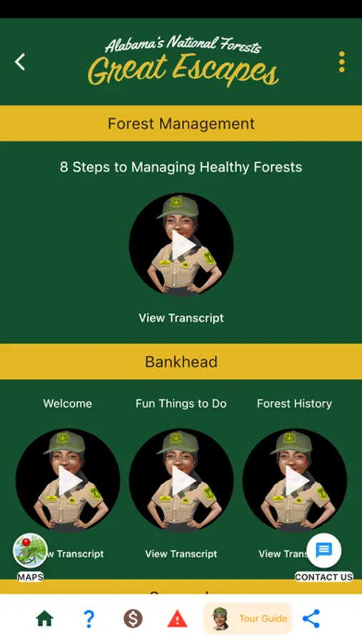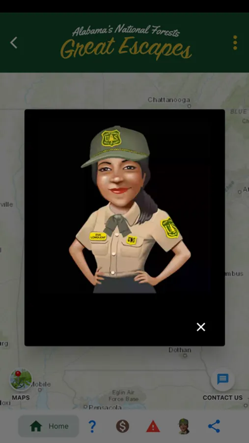 Forest visitors downloading the new Forest Service mobile app will be welcomed by “Eva Longleaf” a Forest Service virtual tour guide providing information on recreation activities, national forest history and what is happening in the natural world surrounding them. Eva Longleaf will explain how national forests are working forests where you can expect to see controlled burns, tree thinning, tree planting and other management activities throughout the year. The projects are focused on maintaining the health and resilience of national forests while at the same time providing products and services to the public. Visitors will also learn about the history of each national forest in Alabama. Eva Longleaf communicates (one-way) with visitors to assist them in planning activities while on the Bankhead, Talladega, Conecuh and Tuskegee National Forest. For 508 compliance, a script is provided for visitors on the mobile app.
