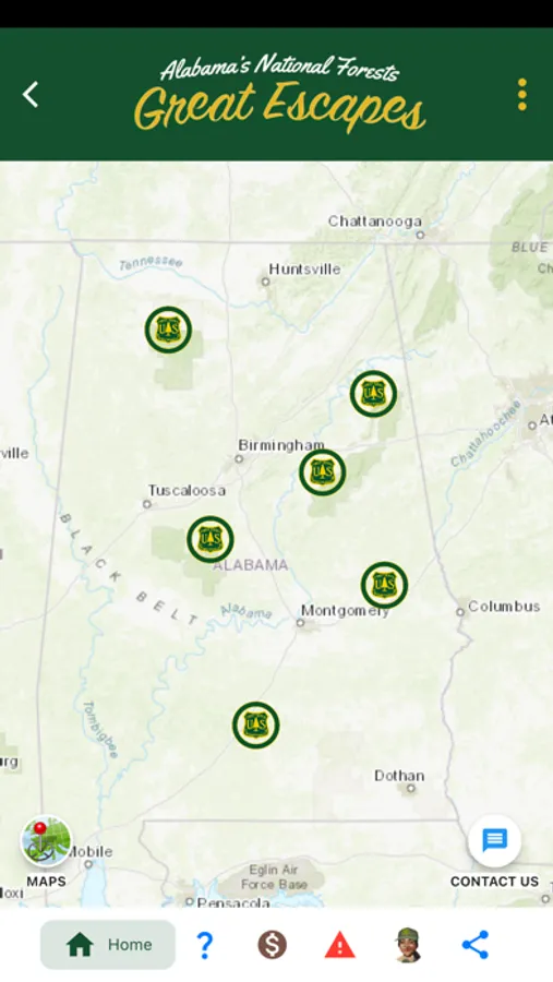 The mobile device application is for outdoor enthusiasts interested in planning trips to Alabama’s four national forests –Bankhead, Talladega, Conecuh and Tuskegee. Using a blend of website and native app capabilities, Alabama “Great Escapes” mobile app provides the following essential information: