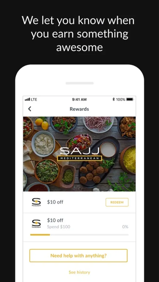 Collect points to redeem rewards, with rewards starting at only 150 points! Choose from a variety of rewards like $20 off, free catering, and free SAJJ swag.