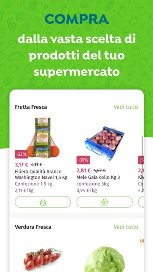 Ricevi la spesa da Alì, Aliper, Auchan, Bennet, Biosapori, Carrefour, Carrefour Express, Carrefour Market, Conad, Conad City Coop, Decò, Despar, Elite, Emisfero, Esselunga, Esselunga Superstore, Eurospar, Eurospin, Famila, Famila superstore, Galassia, Il Gigante, Interspar, Iper Martinelli, Iper tosano, Iperal, Iperconad, Ipercoop, Iperfamila, Iperlando, Ipermercato Conad, Italmark, La Buona Bottega, Leclerc Conad, Lidl, Martinelli, Mercatò, Migross, Natura Sì, Pam, Panorama, Punto Simply, Sapore di Mare, Simply, Simply Market, Simply Store, Super A&O, Super Elite, Super Gulliver, Super Migross, Super Rossetto, Superbasko, Tigros, U2, Zooplanet, Ipercarni and Ipertriscount.