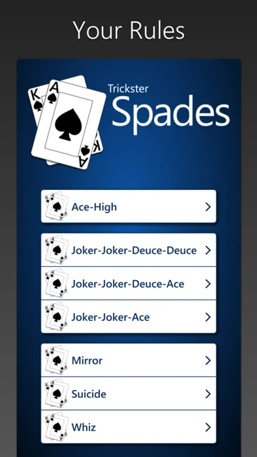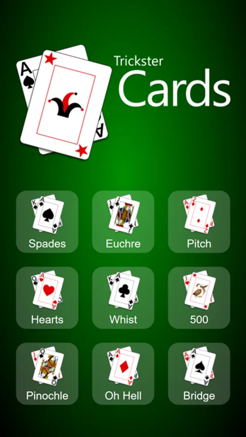 Enjoy Spades, Euchre, Pitch, Hearts, Bid Whist, 500, Pinochle, Oh Hell, or Bridge. Trickster Cards supports them all with customizable rules to play the way you want to play.