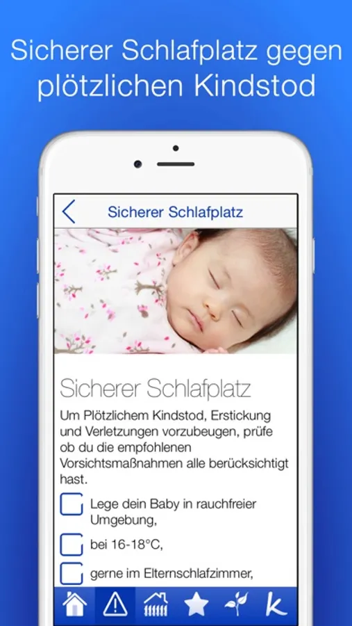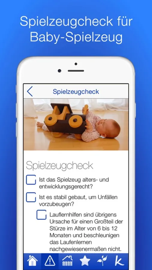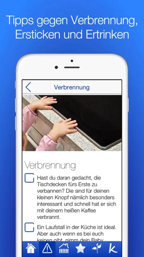 Diese App sensibilisiert dich für mögliche Gefahren im Babyalter und hilft dir mit zahlreichen Checklisten bezüglich Ersticken, Ertrinken, Verbrennung, Vergiftung und Verletzung dein Zuhause Raum für Raum kindersicher zu machen. Auch Balkon, Garten und Spielplatz werden umfassend berücksichtigt. Ist dein Baby in Sicht, stehen zunächst Sturzprävention und Schlafplatz im Vordergrund, aber mit zunehmendem Babyalter häufen sich auch die Gefahren.