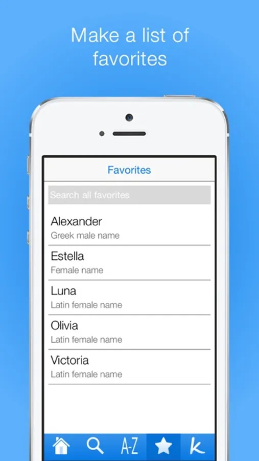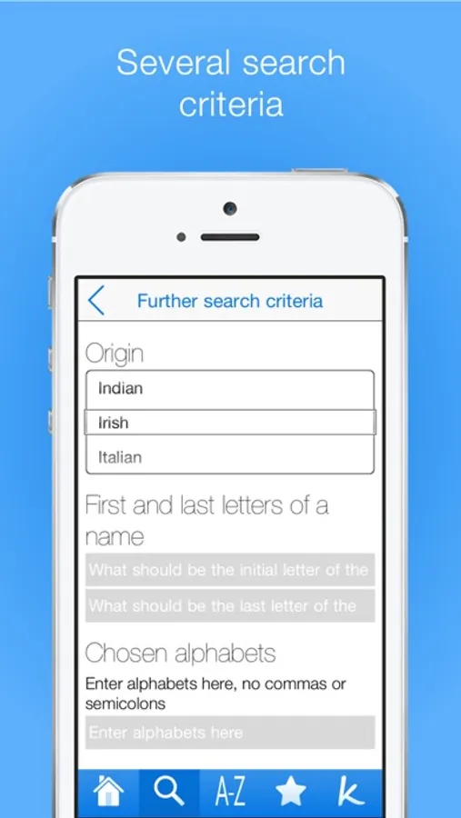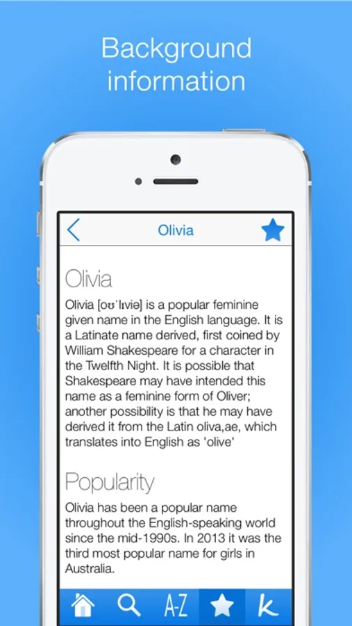 A further instrument for a harmonious sounding full name is the length of the first name. You can play around with different options by clicking the “Further search criteria” and then you’ll get a better idea what you really want. The cultural origin of the name obviously relates to the sound of the name. For example German names and Irish names have distinctive sounds to them. If you have a preference for a particular cultural background, you can choose from a menu in the App. You can also search through biblical names. You can mark the names which you like with a star and make a list of favorites. With the help of that list you can further research the details of each name and share the information with other people.