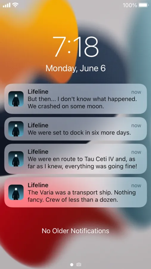 Lifeline pioneered a new narrative experience enabled by modern devices. This story plays out in real time as Taylor works to stay alive, notifications deliver new messages throughout your day. Keep up as they come in, or catch up later when you’re free. You can even respond to Taylor directly from your Apple Watch or your iPhone lock screen, without launching into the app.