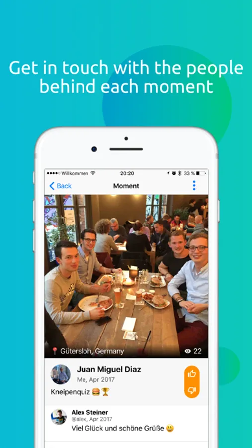 MomentMap notifies users when a moment is shared nearby so that they stay up-to-date about what is happening in the world around them. Once your moment is shared others can connect by using up- and downvotes or commenting your moment.