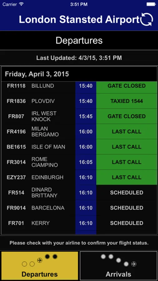 Displays current 'Departures' and 'Arrivals' at London Stansted Airport (STN)
