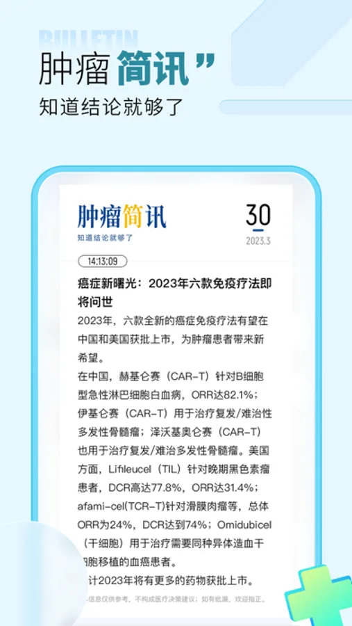 咚咚肿瘤科是一款为肿瘤患者和医生量身打造的全面智能伴侣,紧跟全球最新肿瘤行业动态,让您轻松了解最新进展。随着科技飞速发展,数字医疗已逐渐成为现代医学的重要组成部分。这款应用程序为您提供了丰富的信息,包括最新肿瘤简讯、临床信息、药物查询、案例讨论、肿瘤学指南以及参考文献等。以下是咚咚肿瘤科的六大核心功能: