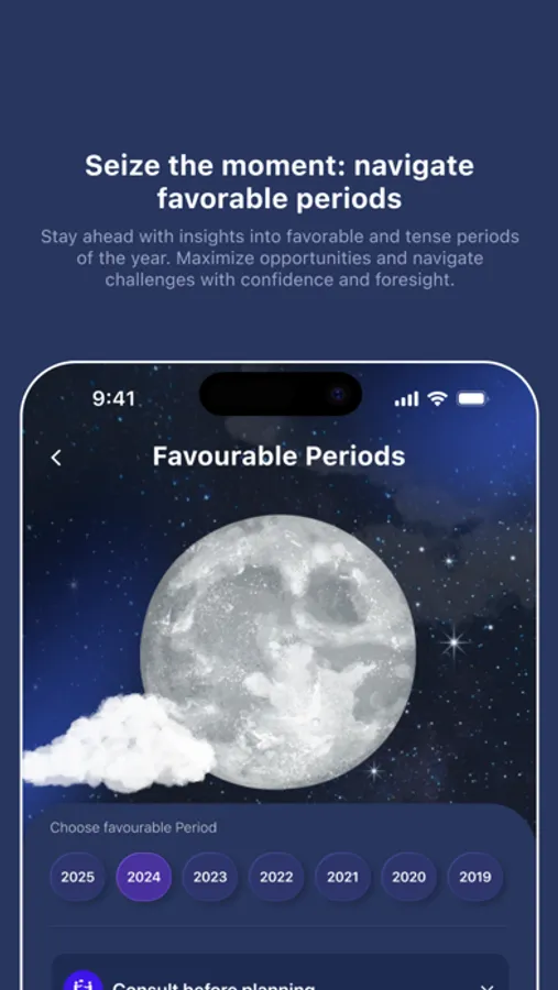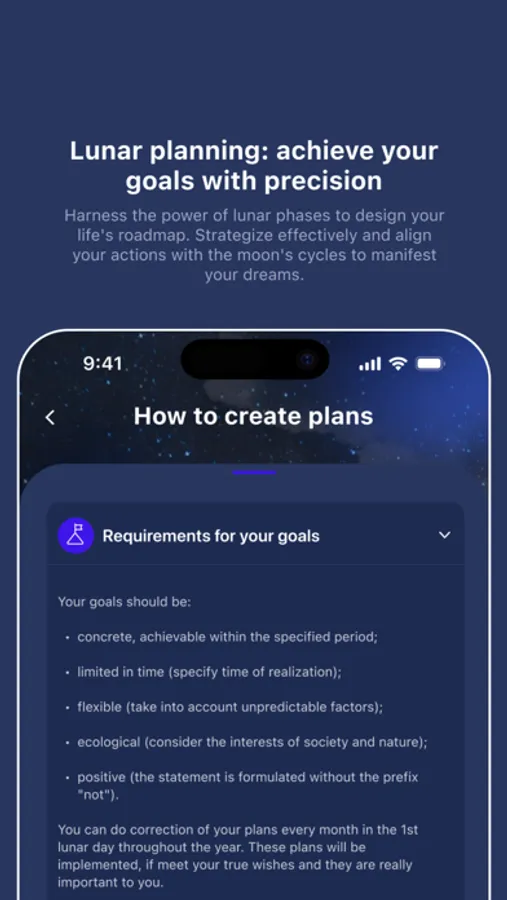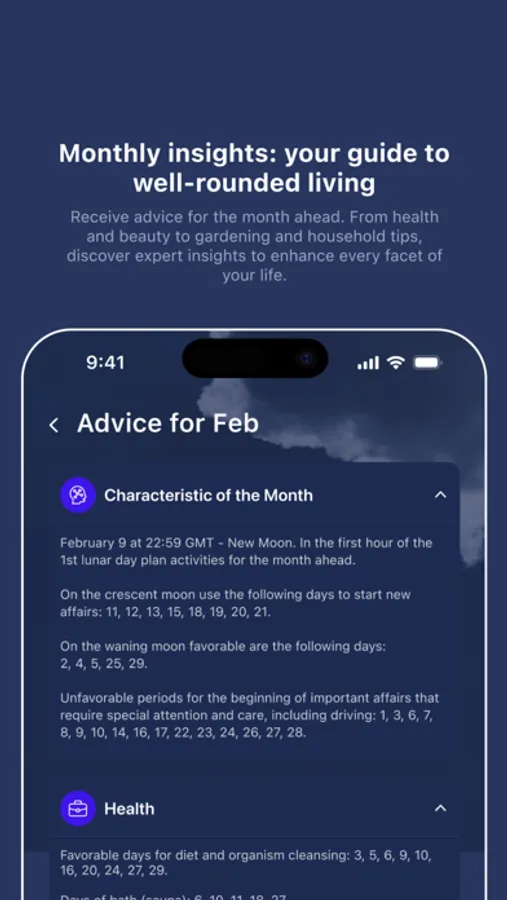The app will allow you to discover how to use the influence of the moon, its phases and other planets to plan ahead. You’ll come to understand which month is more favourable for travel or for a chosen medical procedure. You are able to access detailed information on both the lunar and solar day - each and every day of the year.