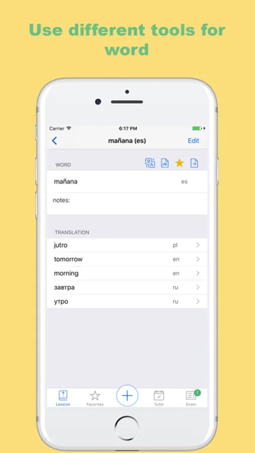 This application will be especially useful when you are learning several languages. The Universal Lexicon allows you to save word translation in different languages.