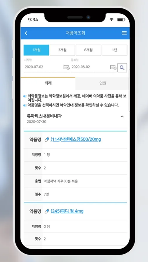 - 처방조회 : 처방 받으신 약의 상세 정보 및 복용법을 확인할 수 있습니다.