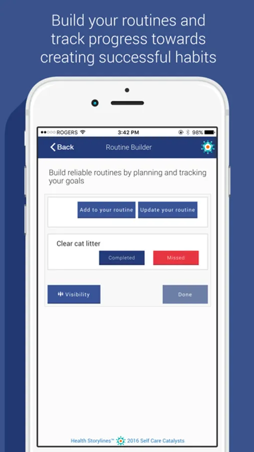 “I like the way I can put in a routine that I want to create, it reminds me and I can keep track of how well I am doing keeping up with my routine through the history graphic. ‘My Storylines’ which summarizes all of my inputs would be valuable to take to my doctor as it is concise enough to make sense of things."