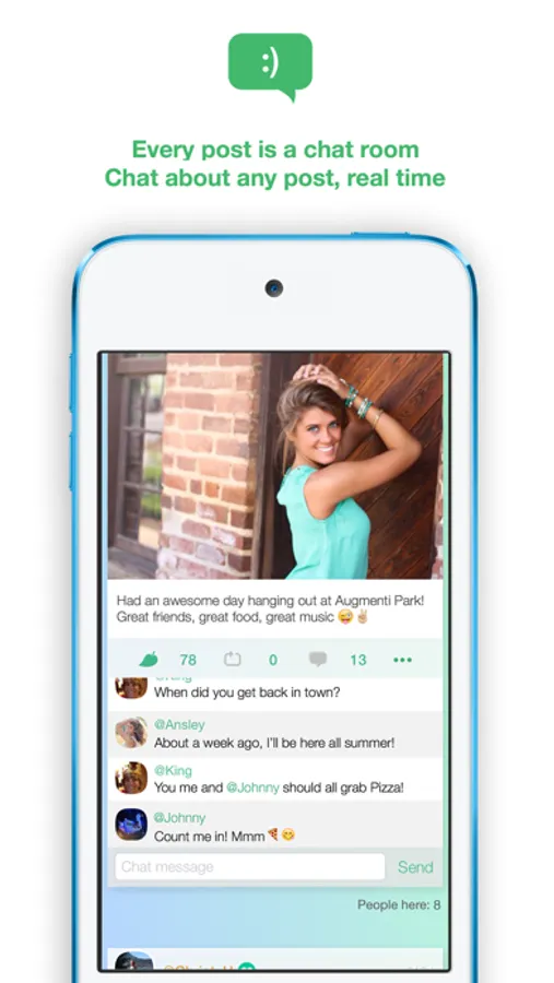Every post is a chatroom and you can join and chat at any time with your friends/followers.