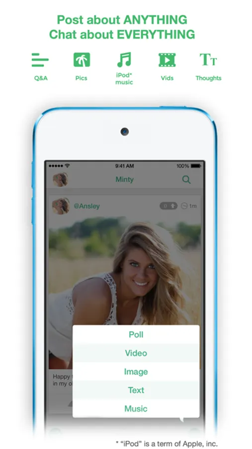 A fresh new place to share, post, and chat about ANYTHING with your followers. No limits—you can post images, videos, text, music; you can even ask polls that can be voted on by your following.