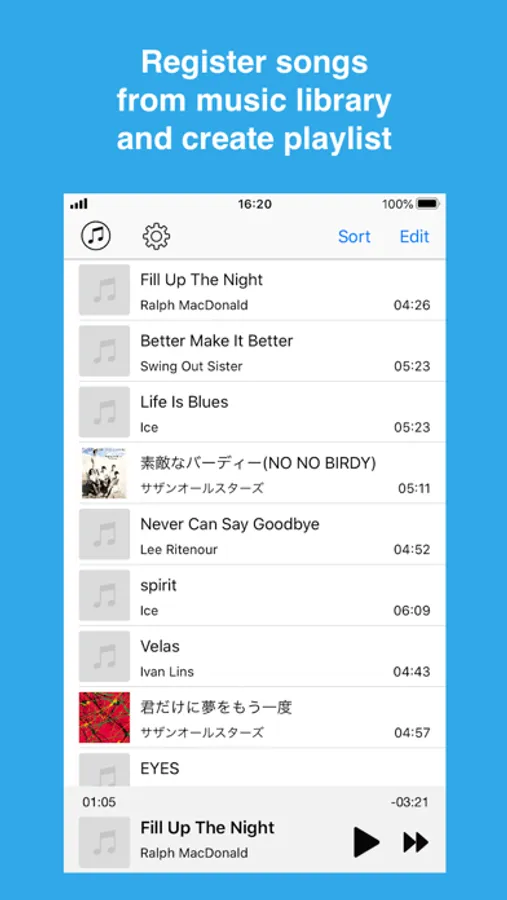 - Register the songs in the music library to the playlist in this application and play the songs in the playlist. (The song data is NOT imported into the application.)