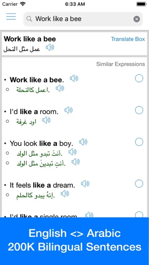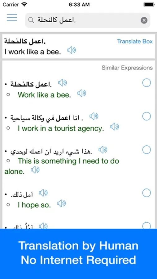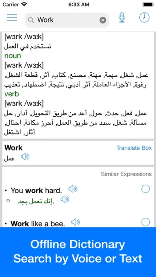 English to Arabic & Arabic to English offline translator & dictionary app with ability to find similar sentences & expressions.