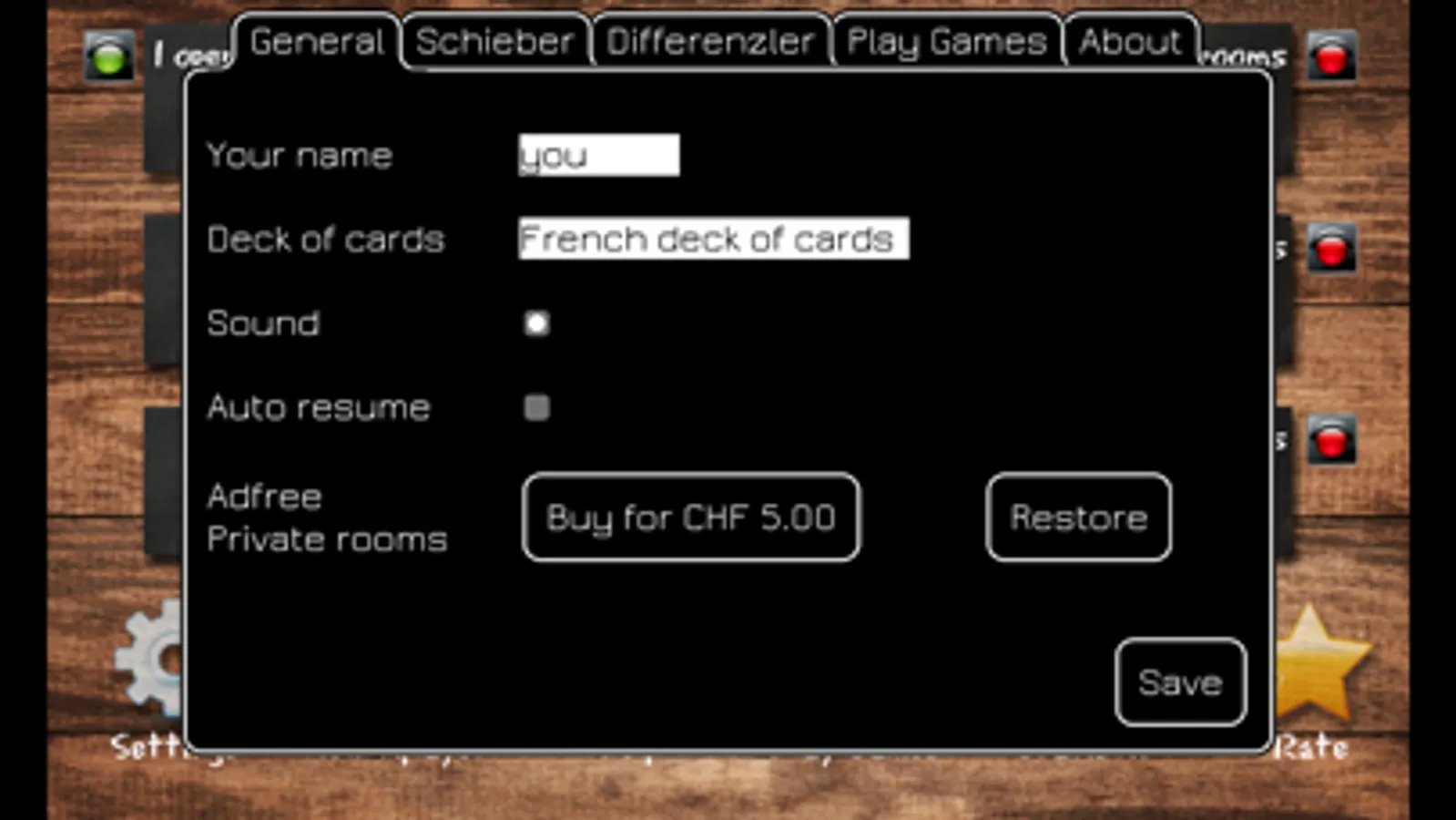 Play Schieber, Coiffeur, Differenzler against the computer or via Bluetooth, Wi-Fi or online with other players.