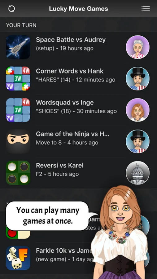 Lucky Move is not a single game, but a collection of online 2-player games for your entertainment. Find your friends by email, username to challenge them to a game. Practice your skills against our robot players (we never taught them how to cheat!). You can also invite random players to join you in a game. Quickly invite someone you already played to a rematch after a game, or with our quick select menu!