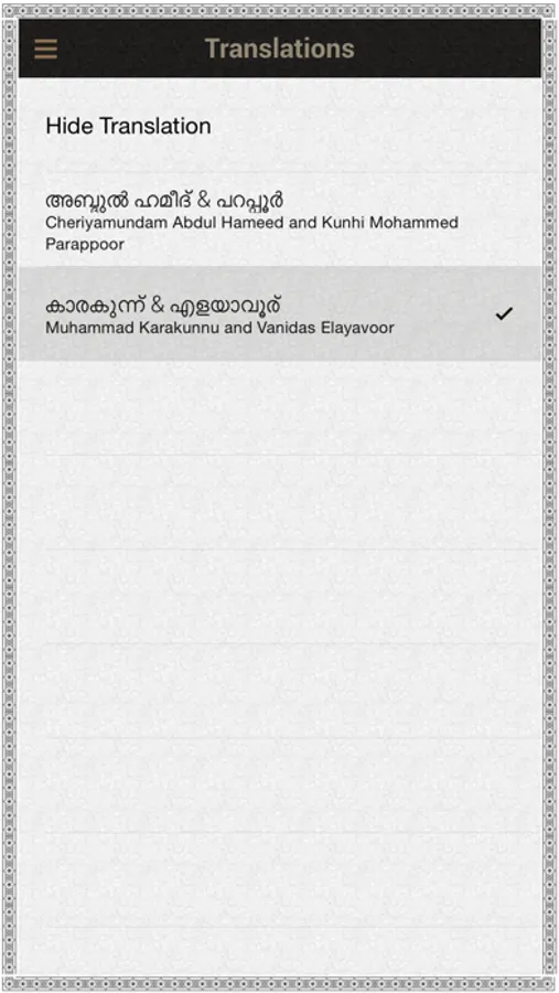 • Complete list of translators is Muhammad Karakunnu and Vanidas Elayavoor and Cheriyamundam Abdul Hameed and Kunhi Mohammed Parappoor.