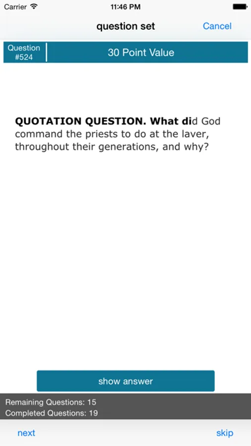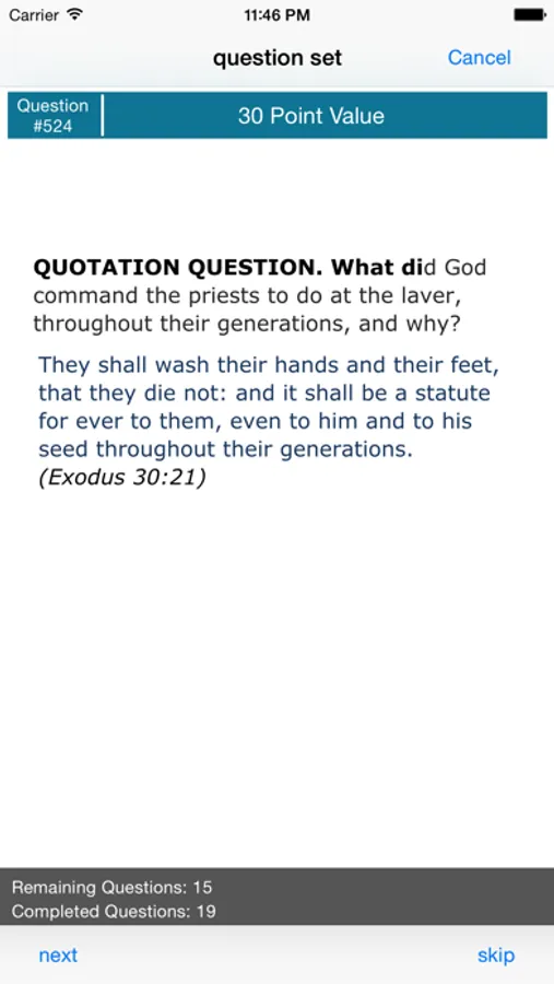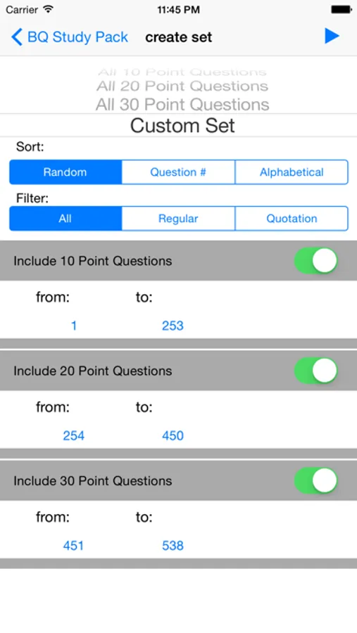 Bible Quiz Study Pack allows you to create sets of questions flash card style from a specific Bible Quiz category. You can choose your category and language and begin testing yourself with questions. You can select a custom range of questions filtered by their point value, by question type, or just choose all the questions.