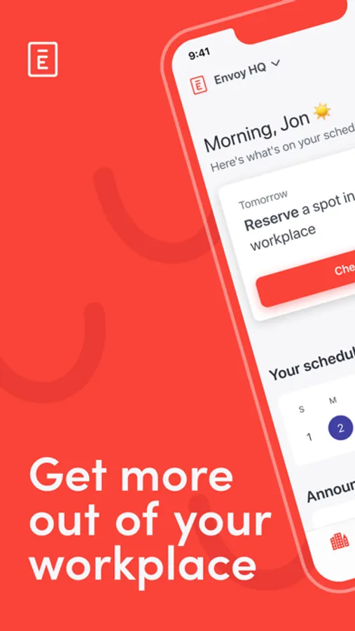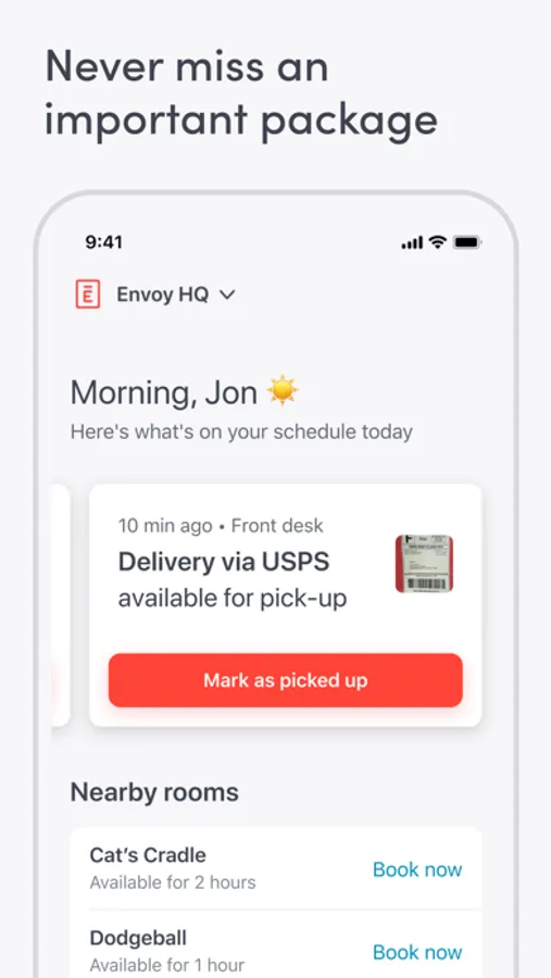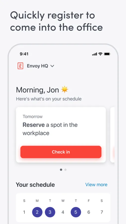 Make your workplace work better for you with Envoy. Coordinate your office schedule with coworkers, see where to go with workplace maps, reserve the perfect desk, book a nearby conference room, invite visitors, get notified about packages, report workplace issues, and more.