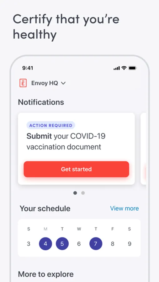 Get cleared to work onsite by submitting proof of vaccination or completing a health check. Once you arrive, reduce the spread of germs with a touchless sign-in using the Envoy mobile app.