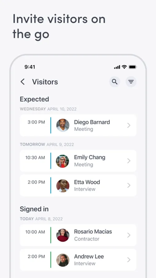 Invite guests to your office and keep track of who is scheduled to arrive and when, so you’re prepared for every visit. Receive a notification when your visitor arrives so your guest is never kept waiting.