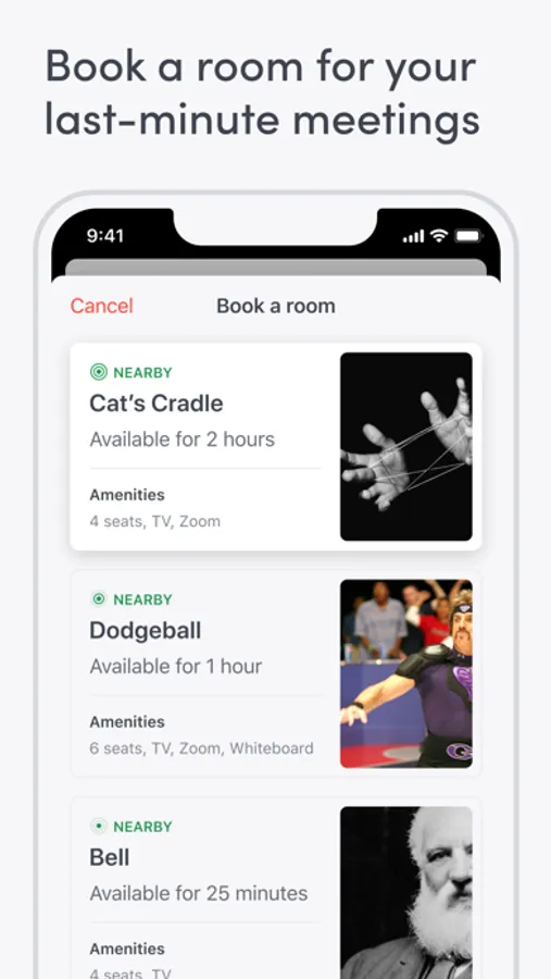 Easily find the closest available meeting room on the interactive workplace map, so you can book a space, even when you’re on the go. Check in to your next meeting right from your phone, or free up the room for someone else.
