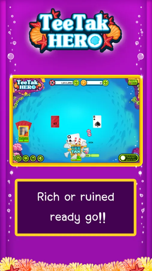 TeeTak Hero card game online in a brain training, you can join other players to play and send emoticon message during playback fun. Just enjoy your 4 cards with 1 card from midfield. Check your cards with midfield. The cards are not the same, you lose. But if the same and the more points you win. If you're sure to win, Select TeeTak and wait for a chance to win all of the money from midfield.