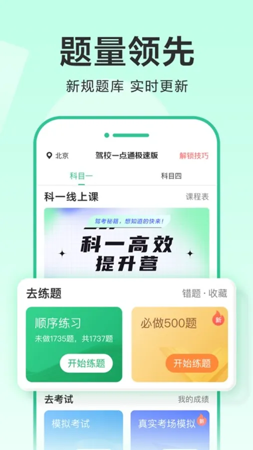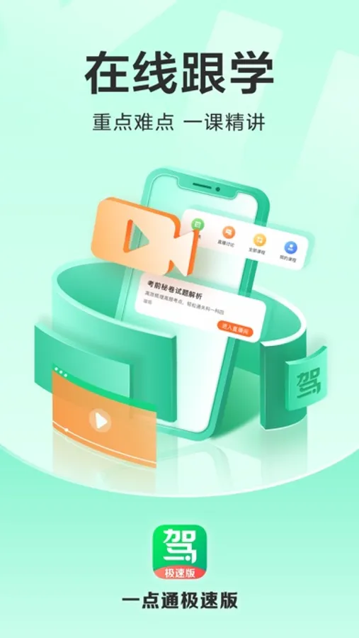 考驾照,先上驾校一点通,基于“帮助用户学习驾照理论考试”的理念,我们打造了驾校一点通极速版APP。精编500题,让用户摆脱盲目刷题;每一题都有明确易懂的解题技巧,让学员高效记忆!