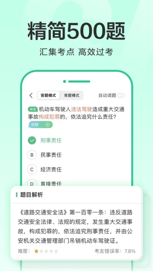 特邀驾校教练,结合考友练题大数据,提炼驾考知识点和考点下有代表性的题目,推出精编500题,拒绝盲目刷题!