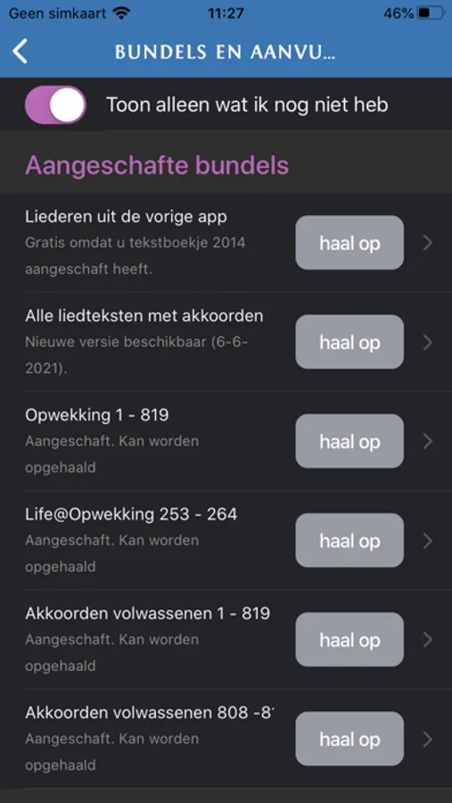 Deze gratis versie bevat een beperkt aantal liedteksten. Dit zijn de teksten waarvan wij zelf de rechten hebben. Maar voor een klein bedrag kan je aanvullingen aanschaffen en zo zelf te kiezen welke liedteksten jij altijd op zak wilt hebben.